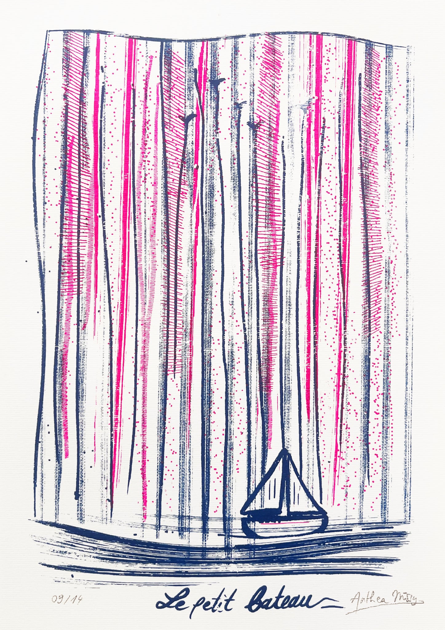 « Le petit Bateau » vogue face à l’immensité d’un voile strié de bleu nuit et de rose vif. Comme à travers une pluie infinie figée ou un rideau de vagues qui n’en finit pas de tomber, un minuscule voilier se tient. Pas en tempête, pas en fuite: juste là.