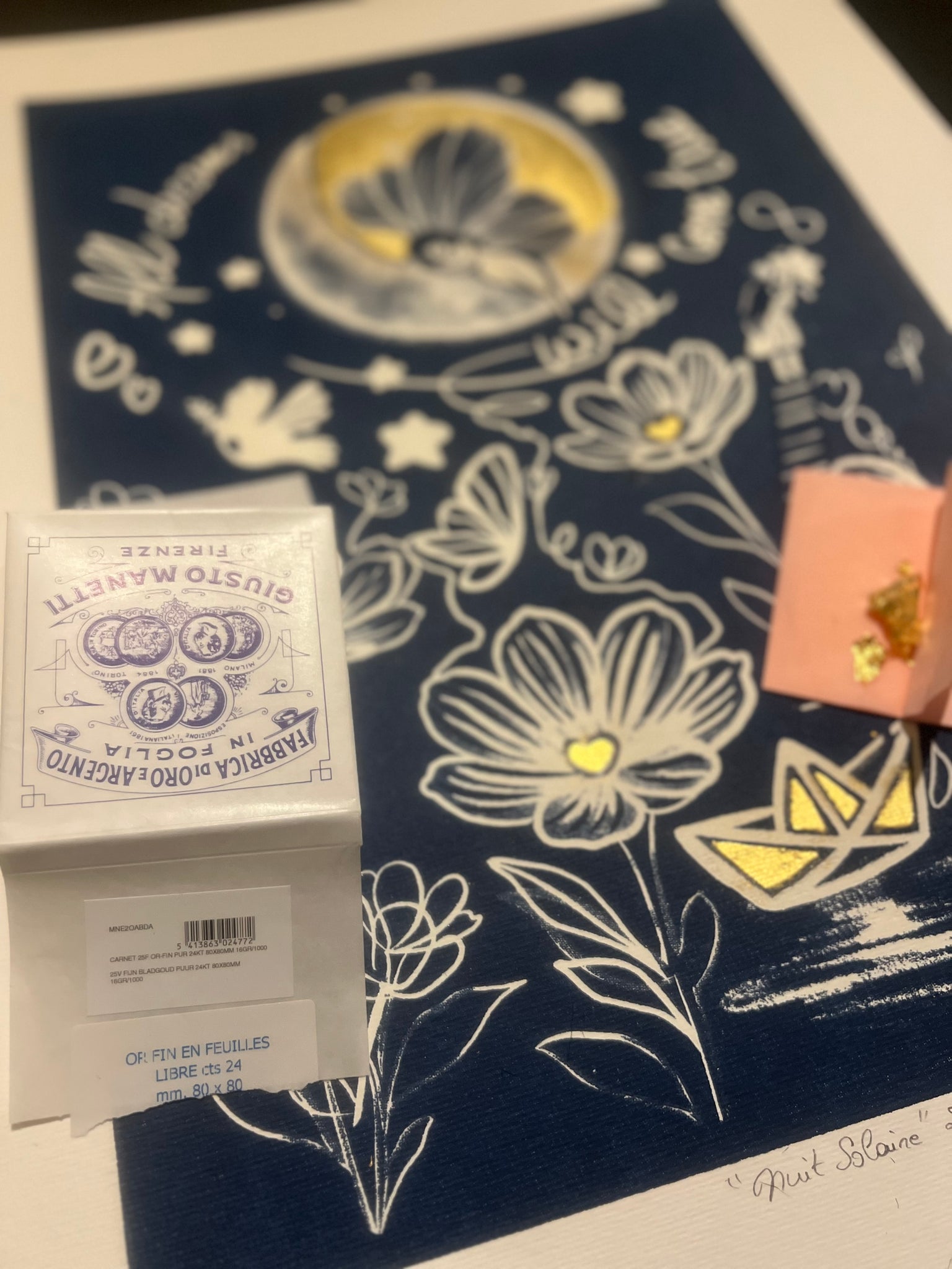 Une scène onirique et poétique où lune, fleurs, fée et éléments flottants composent un univers doux et lumineux. Les rehauts de feuille d’or 24 carats et l’effet phosphorescent confèrent à cette composition délicate et entièrement artisanale une dimension magique et changeante. Chaque impression réalisée à la main en sérigraphie possède de légères variations, rendant chaque tirage unique.